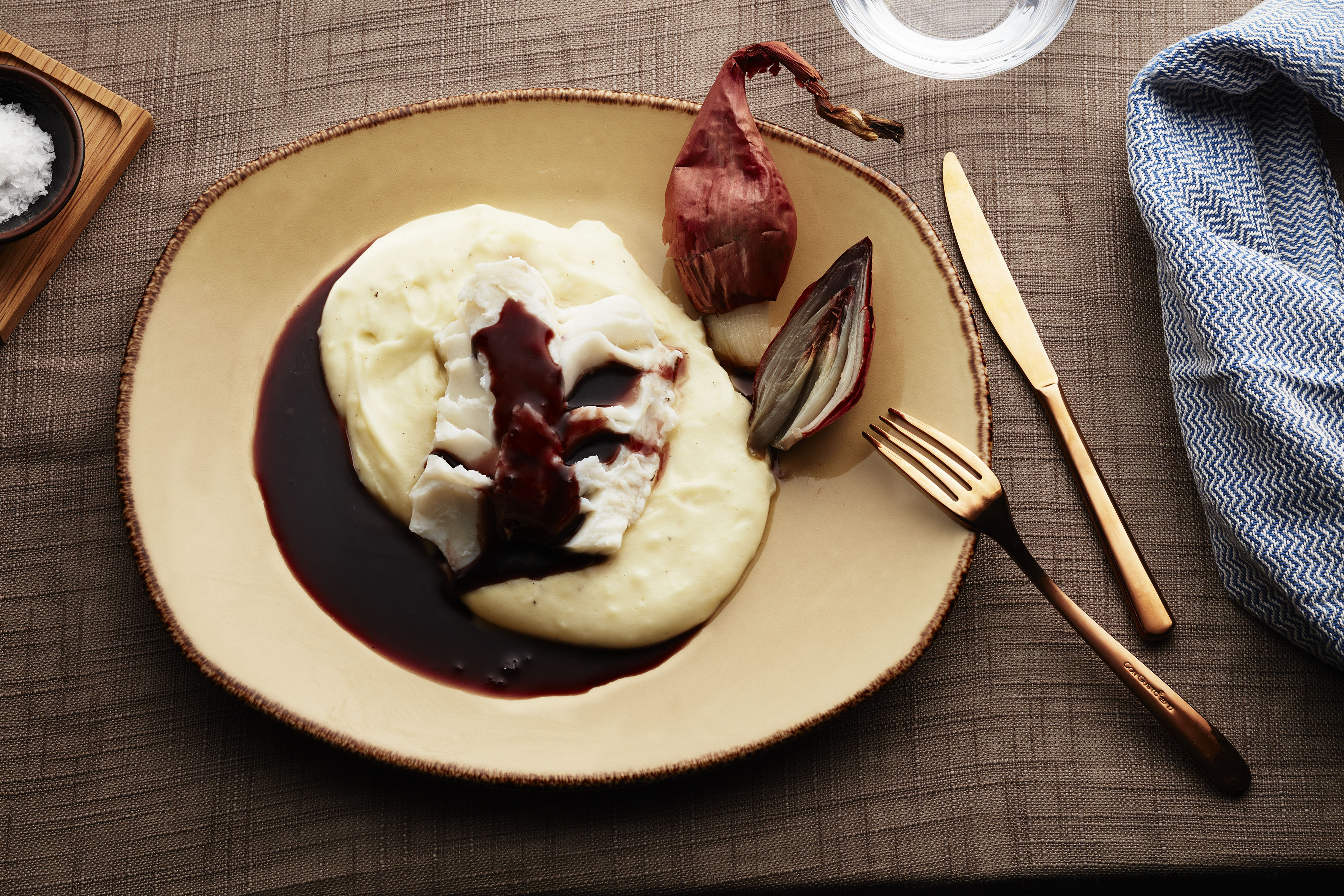 - When the potatoes are done mix/mash them in the remains of the boiling water and add the olive oil, rosemary, sliced black olives and pieces of fish. Let all this boil until the fish is tender - about 5 minutes.